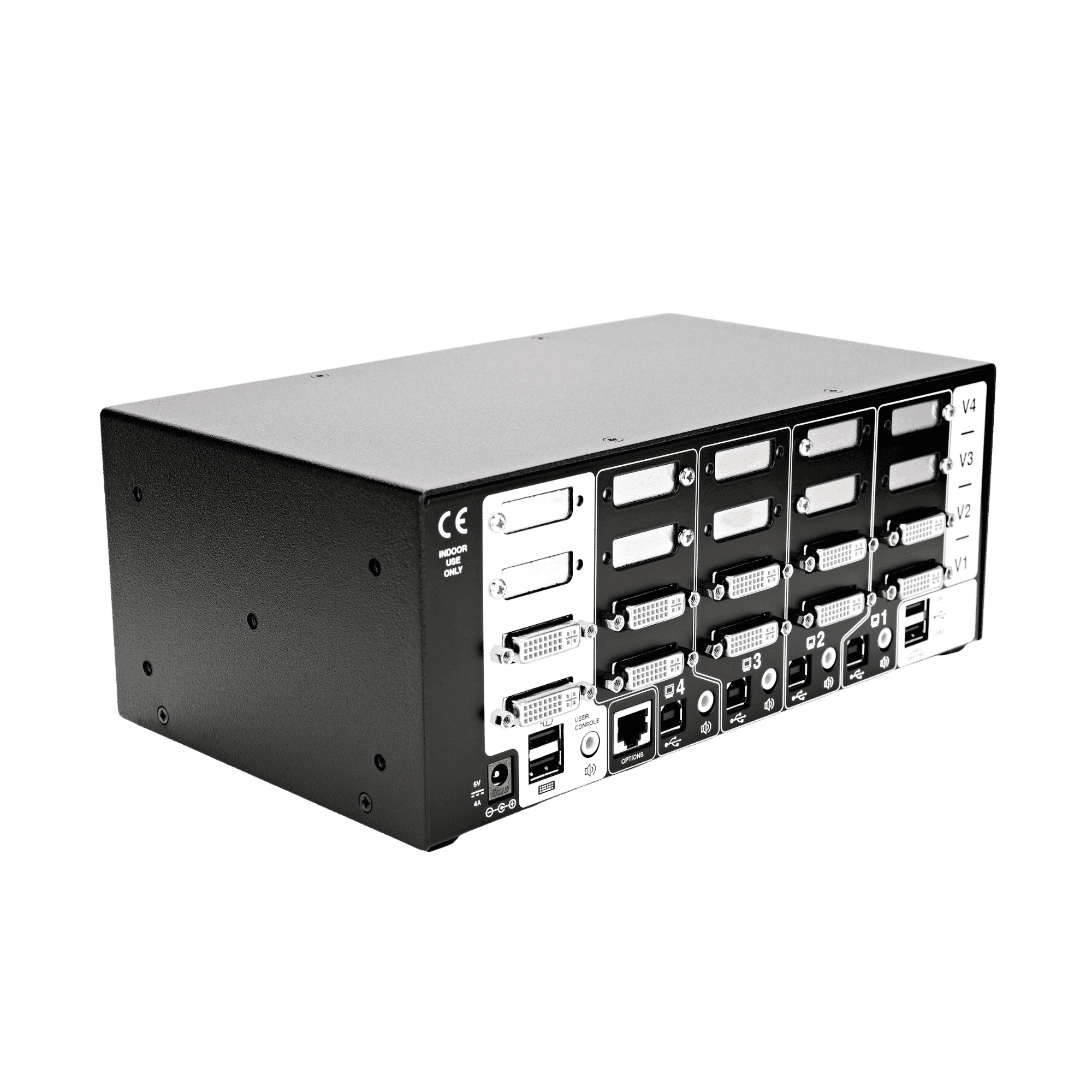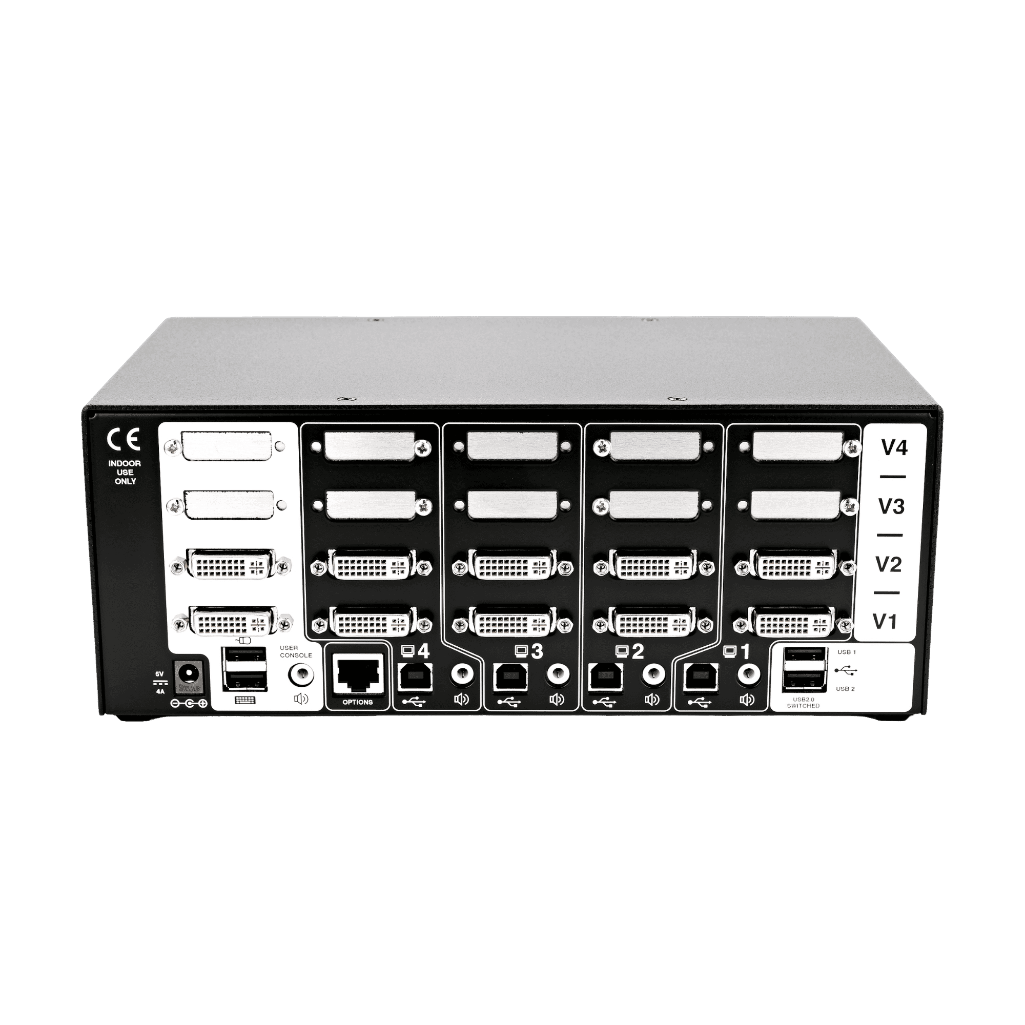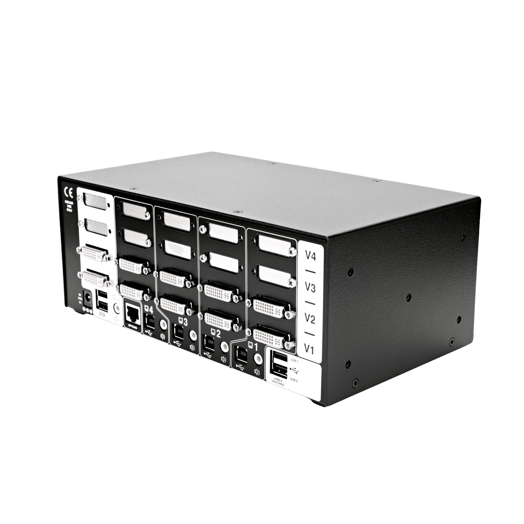 - Shares digital video and USB between up to 4 quad-head computers through a DVI connector